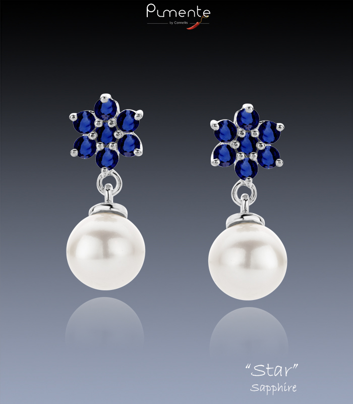 2 magnifiques Perles naturelles Blanches embellies de 14 Saphires montées en étoile serties sur une monture en argent 925 Rhodié.