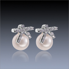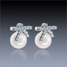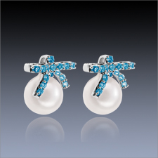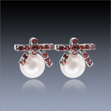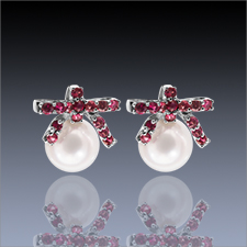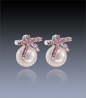 2 splendid genuine White Pearls with 28 Pink Tourmalines mounted in ribbon shape, set on 925 Sterling Silver with Rhodium finish .