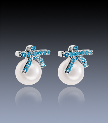 2 splendides Perles Blanches naturelles finies de 28 Topazes Blues montées en forme de rubans, serties sur une monture en argent 925, Rhodié .