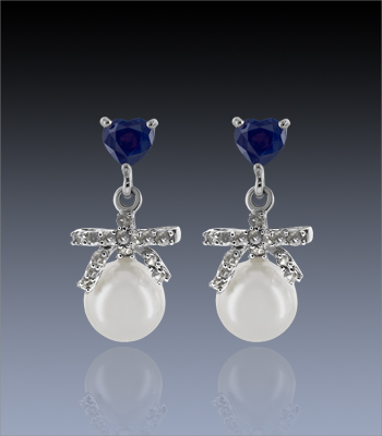 2 Perles Blanches naturelles et 28 Diamants Blancs surmontés de 2 magnifiques coeurs en Saphirs, serties sur une monture en Argent 925 Rhodié.