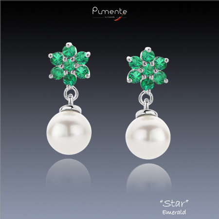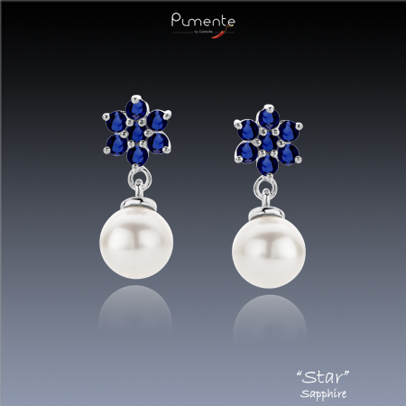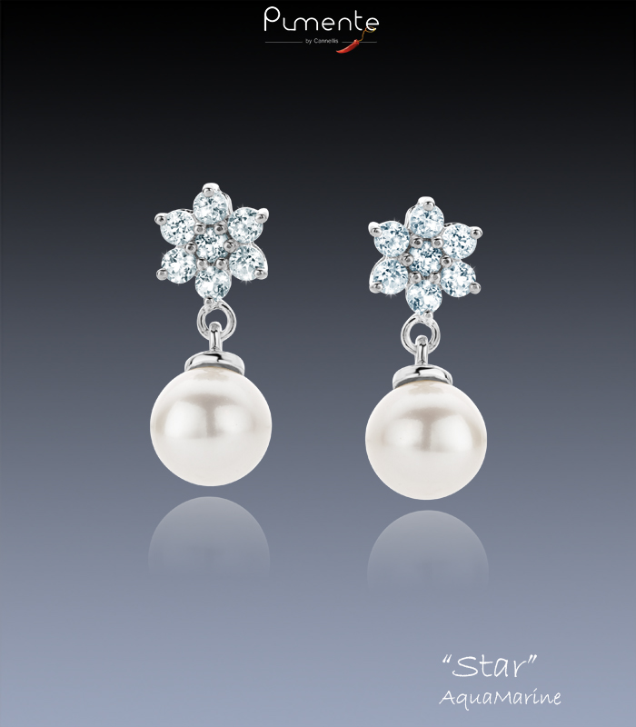 2 magnifiques Perles naturelles Blanches embellies de 14 Aigue-Marines montées en étoile, serties sur une monture en Argent 925 Rhodié.