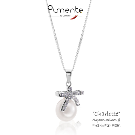Perle Blanche authentique couronnée de 14 Topazes Blues claires, serties sur une monture en Argent 925 Rhodié.